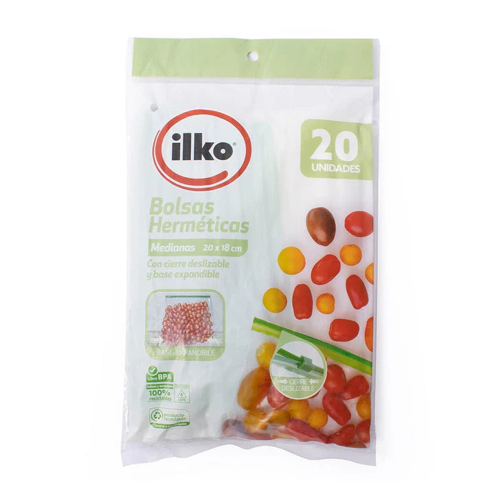 Para llevar las colaciones de tus hijos o tu pan para el desayuno, cuenta con la bolsa hermética slider 20 x 18 cm 20 un de Ilko. Cuenta con cierre zipper y base de 4 cm.