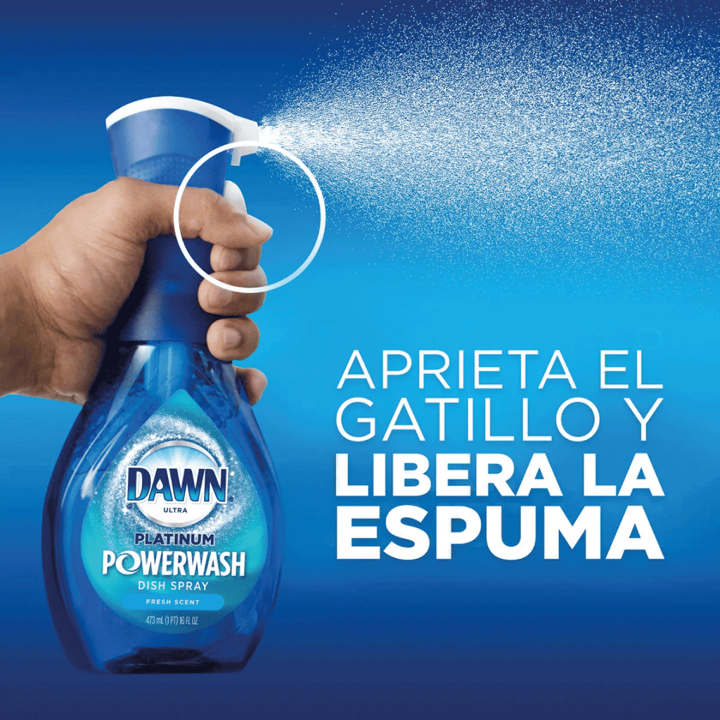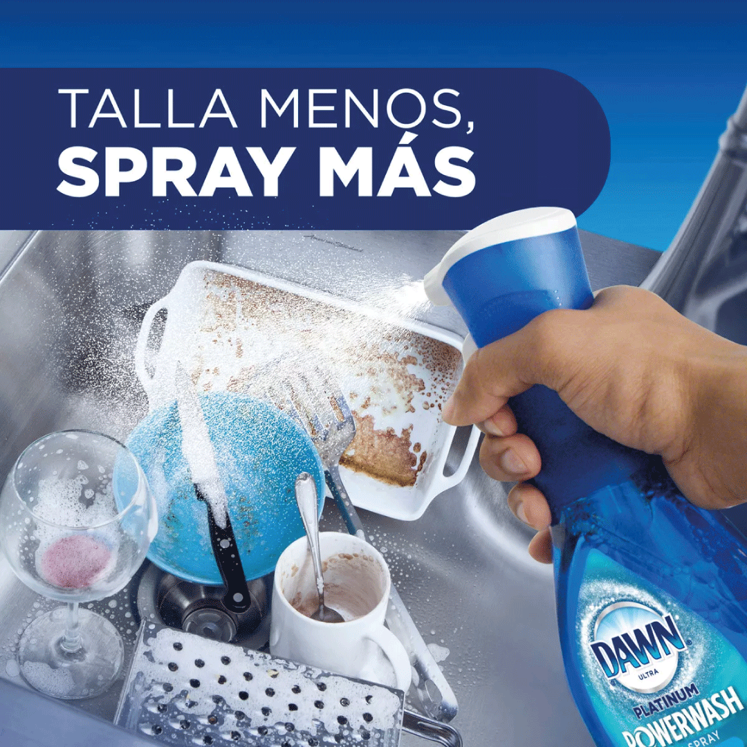 El lavaloza en spray Dawn Platinum Powerwash, el jabón para platos es la manera más rápida y fácil de limpiar. Las espumas activadas por pulverización cortan la grasa al contacto, sin agua para una limpieza de grasa. Simplemente rocíe, limpie y enjuague. Dawn Powerwash es ideal para todos tus platos con su exclusiva tecnología de pulverización incluso tus artículos de difícil acceso, como licuadoras y biberones, son fáciles de limpiar. Solo, rociar, limpiar y enjuagar.