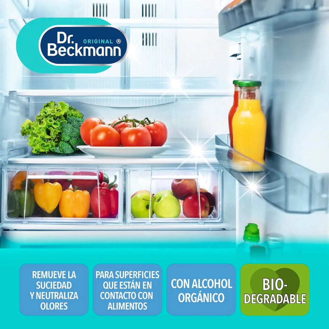 Estudios de los principales institutos internacionales de salud (ej. NSF en 2011) muestran que el refrigerador es uno de los lugares más contaminados del hogar. Es por eso que Dr. Beckmann recomienda limpiar completamente el interior de su refrigerador por lo menos una vez a la semana. El Limpia Refrigeradores de Dr. Beckmann ayuda a limpiar higiénicamente el interior de los refrigeradores, microondas y todas las superficies de su cocina que están en contacto con los alimentos. Su fórmula natural elimina los olores y es seguro de usar alrededor de la comida. Biohigiénico – con alcohol de origen vegetal.