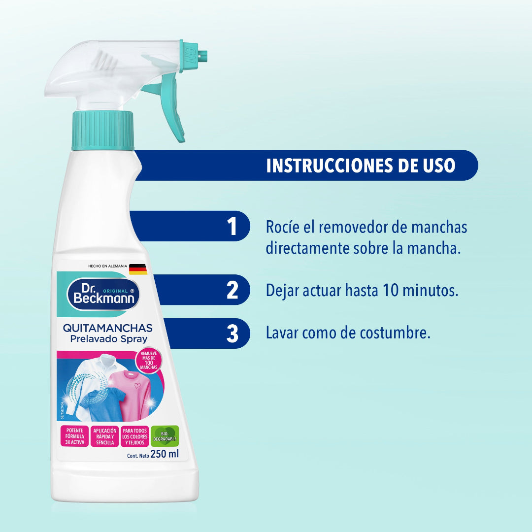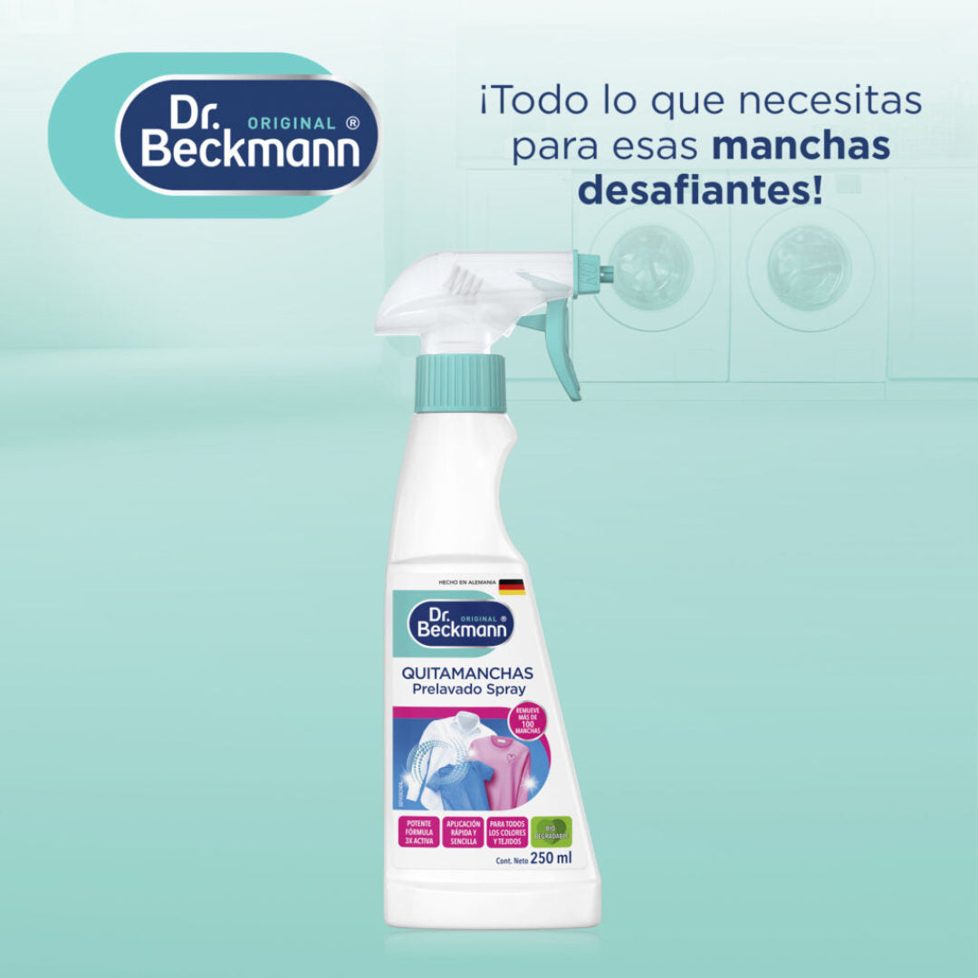 Quitamanchas Prelavado en Spray de Dr. Beckmann elimina las manchas más difíciles: grasa, aceite, sangre, leche, fruta, kétchup, verduras, alimentos infantiles, etc., sin alterar los tejidos y colores.