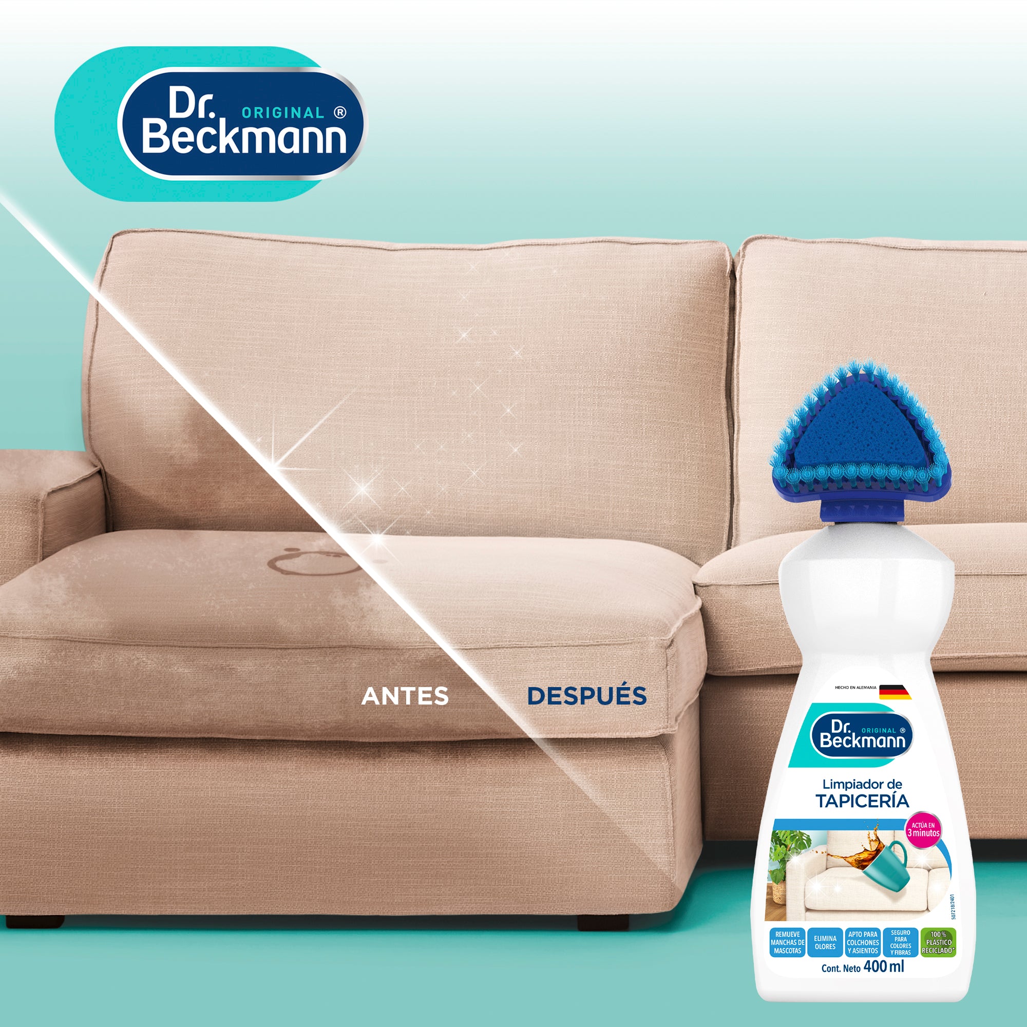 Tu sofá, alfombras y tapicerías sufren el desgaste diario de manchas y olores. El Limpiador de Tapicería Dr. Beckmann es el experto que necesitas para devolverles la vida. Su potente fórmula de Acción Oxígeno penetra profundamente en las fibras, eliminando eficazmente la suciedad y los olores, y dejando una limpieza profesional.