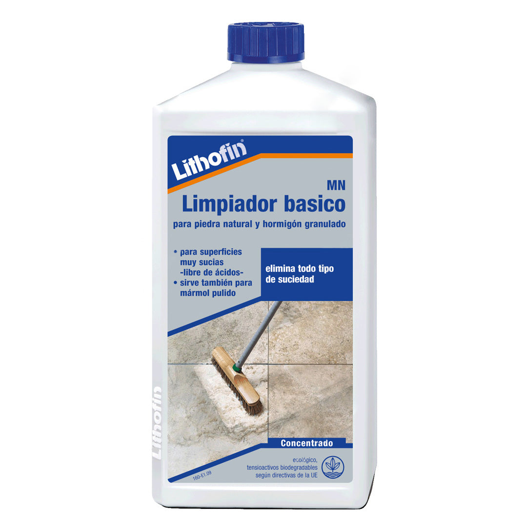 Lithofin MN Limpiador Básico es un limpiador concentrado, fabricado y envasado en Alemania. Está especialmente diseñado para piedra natural, hormigón y superficies sensibles con suciedad intensa. Elimina grasa, restos de obra, residuos de productos limpiadores y películas brillantes sin dañar el material. Libre de ácidos y solventes, con bajo olor y acción potente. Rinde entre 10 y 30 m² por litro, según el grado de suciedad, devolviendo la textura y la belleza natural de las superficies.