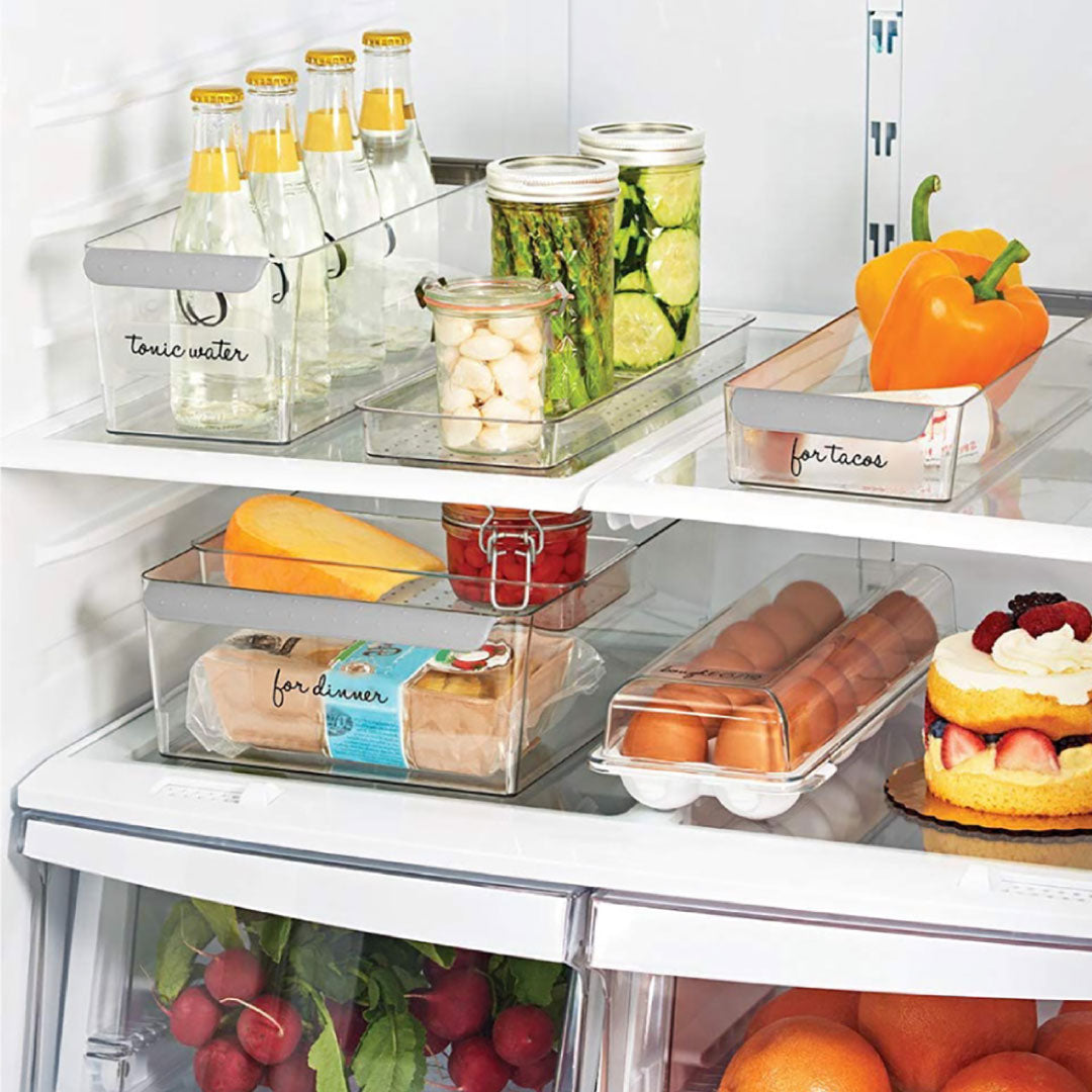 Este organizador versátil almacena artículos de manera eficiente en la nevera o despensa. Cuenta con dos mangos antideslizantes para transportar, área de rotulación en seco, base antideslizante que mantiene las cosas en su lugar y esquinas redondeadas para facilitar la limpieza. Sin BPA y sin alimentos