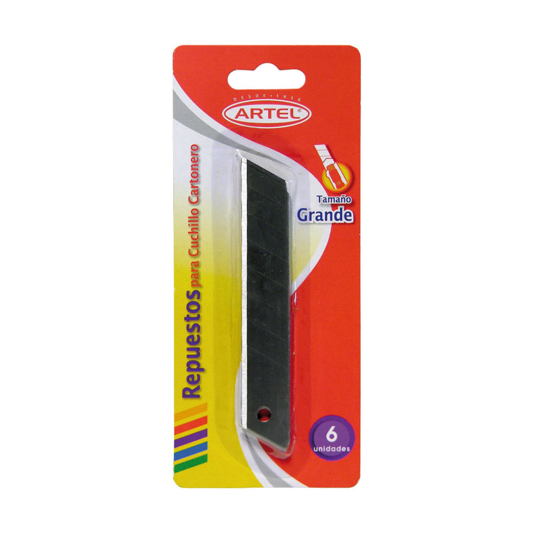 Set de 6 hojas de repuesto de alta calidad marca Artel, diseñadas para cuchillos cartoneros grandes (18 mm). Fabricadas en acero resistente para cortes precisos y limpios en diversos materiales, garantizando durabilidad y seguridad en el trabajo de oficina o bodega.